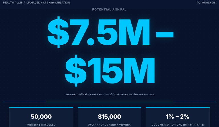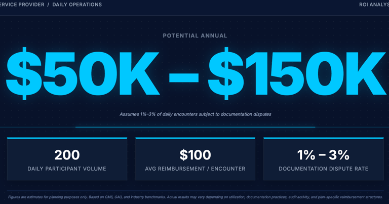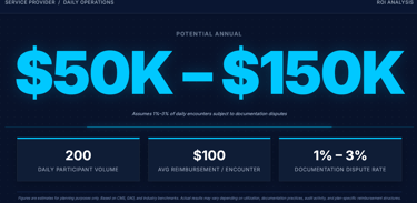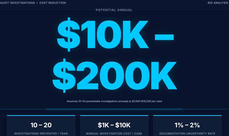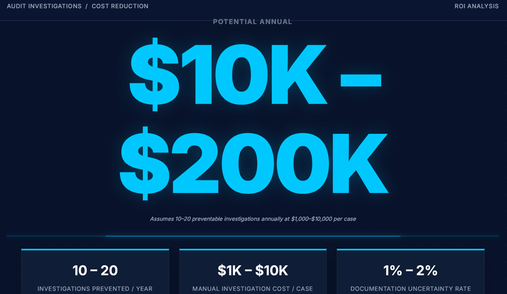 If improved encounter verification prevents 10–20 investigations annually, organizations could potentially reduce costs by: